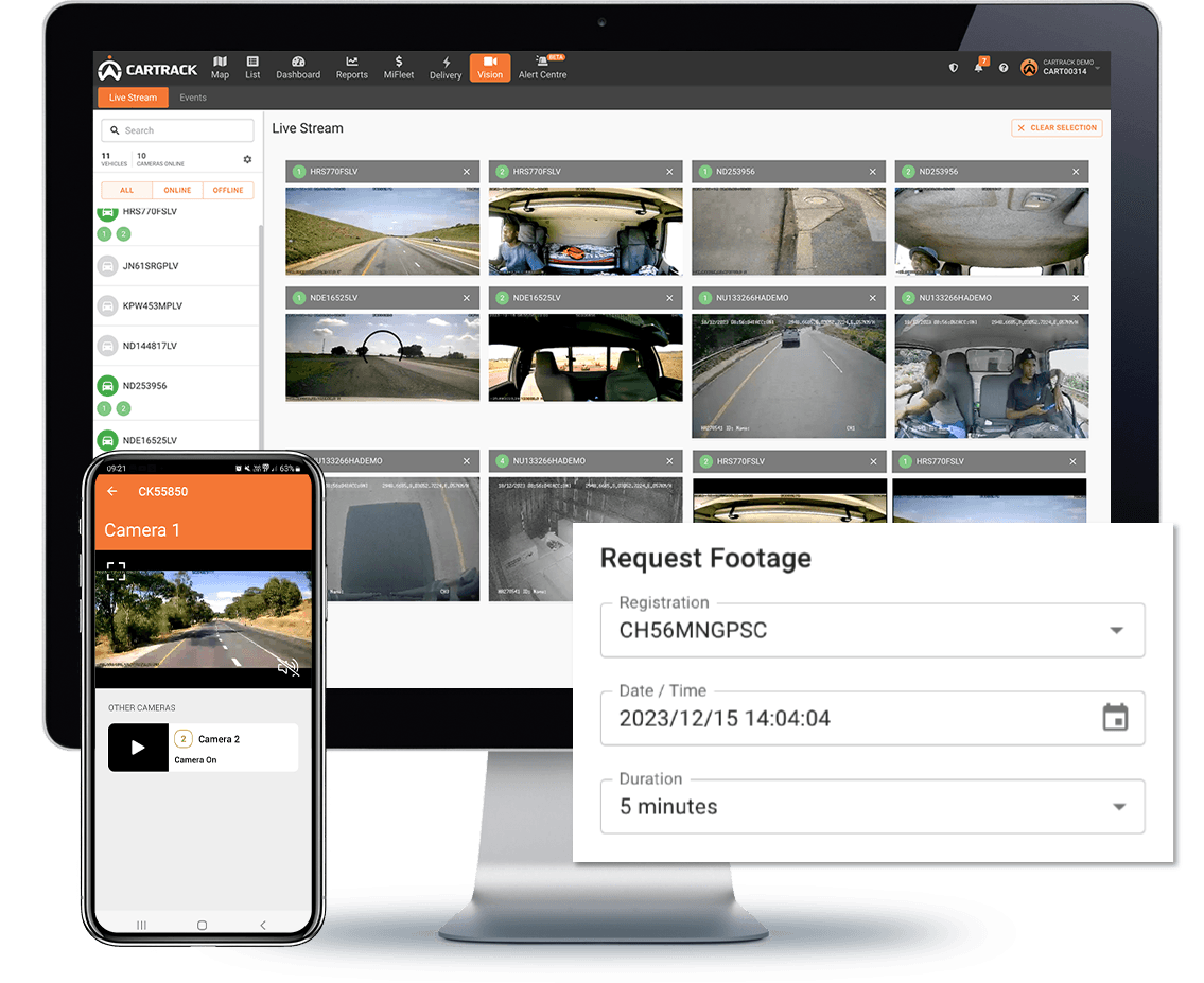 Cartrack’s Free 14-day demo includes LiveVision AI dash camera; any additional cameras may require a separate subscription or upgrade depending on fleet size